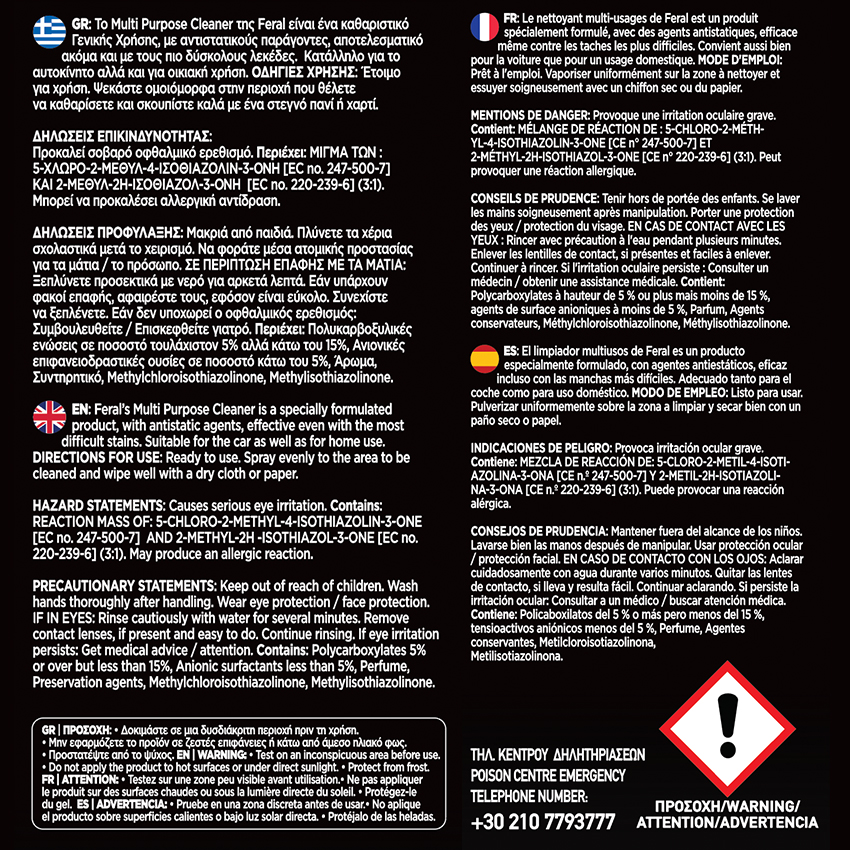 Feral Detailing Pro Multi Clean with a a refreshing Crystal Blue scent, is a versatile all-purpose cleaner, that provides deep, effective cleaning without leaving any residue. Effortlessly tackles dust, dirt, and stains on all surfaces, revealing their true radiance. Suitable for cars, homes, or work environments — leaving a clean and soothing aroma. Surface-friendly yet dirt-fighting, ideal for daily upkeep.