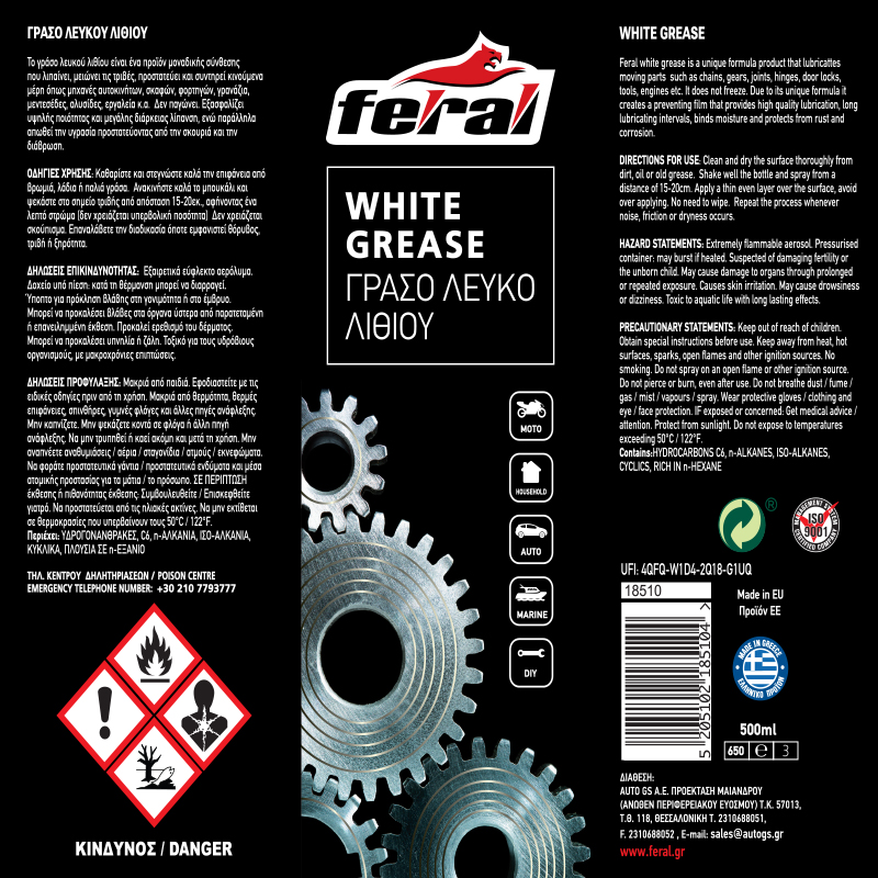 Feral white grease is a unique formula product that lubricates moving parts such as chains, gears, joints, hinges, door locks, tools, engines etc. It provides good performance under high friction loads. It is the most appropriate product for applications on mechanical moving parts and can be used in wide temperature ranges. Due to his unique formula it creates a preventing film that provides high quality lubrication, long lubricating intervals, binds moisture, and protects from rust and corrosion.